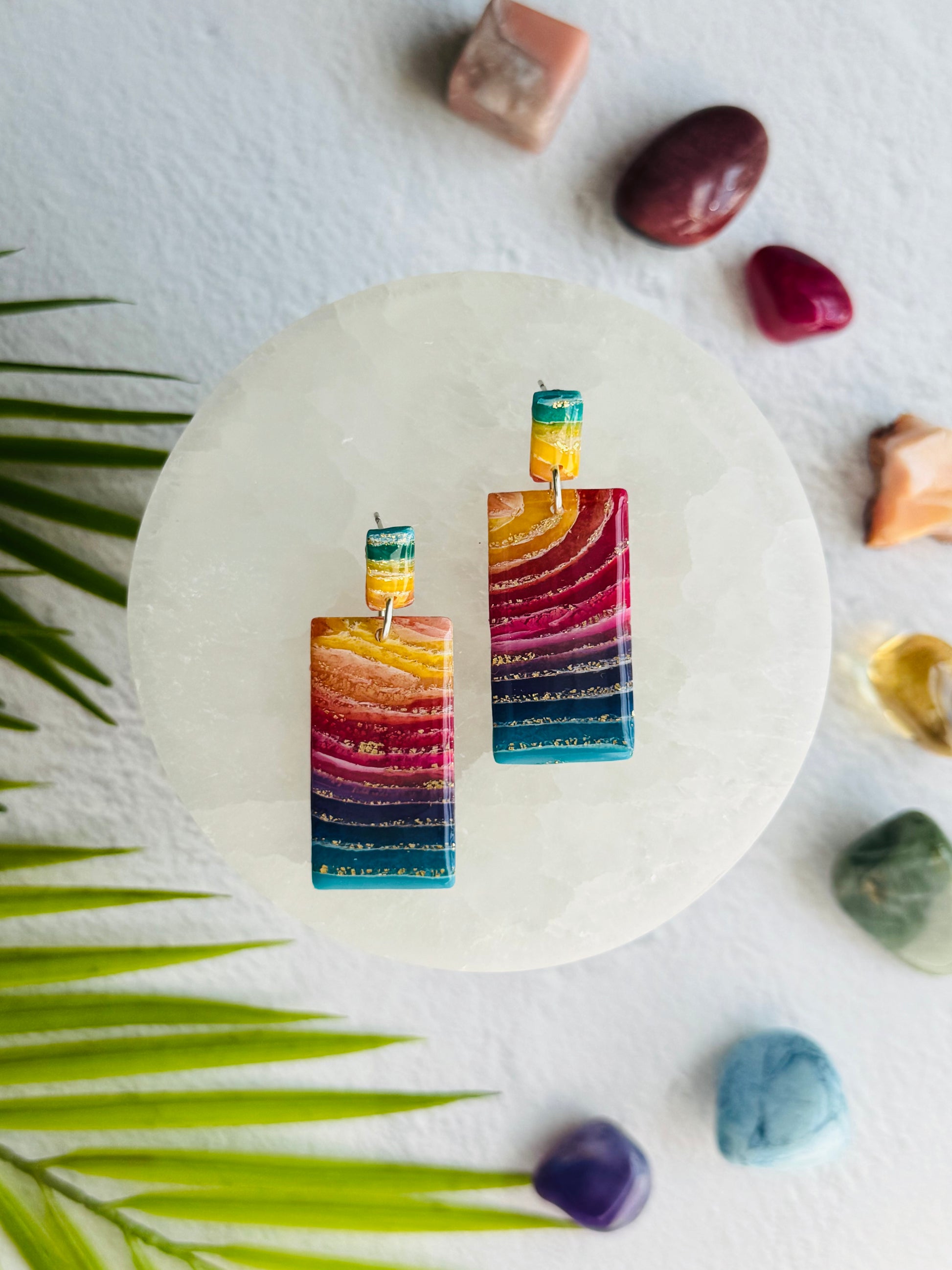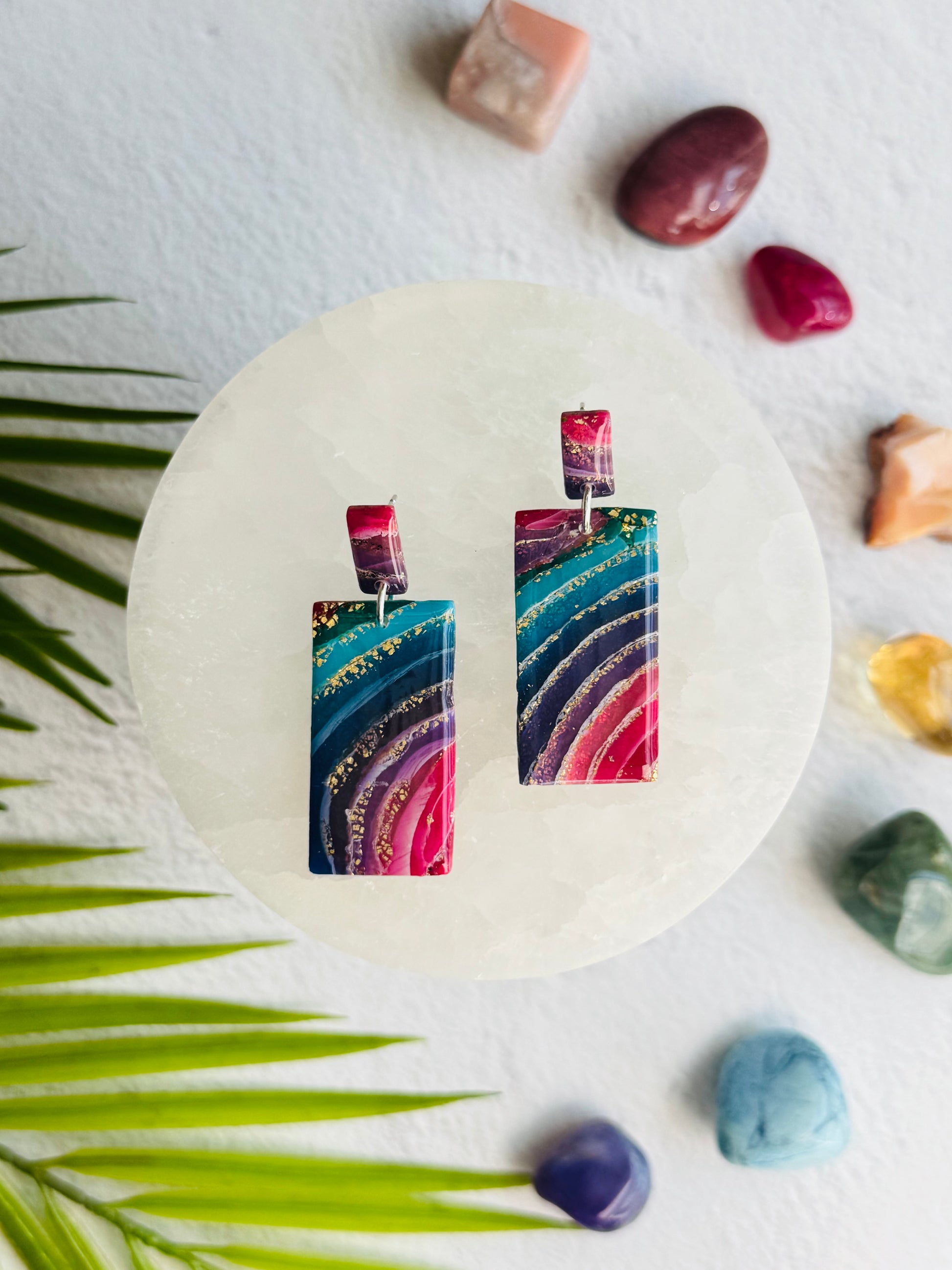 Large rectangle duo earring, on a rhodium plated, nickel-free ear post.