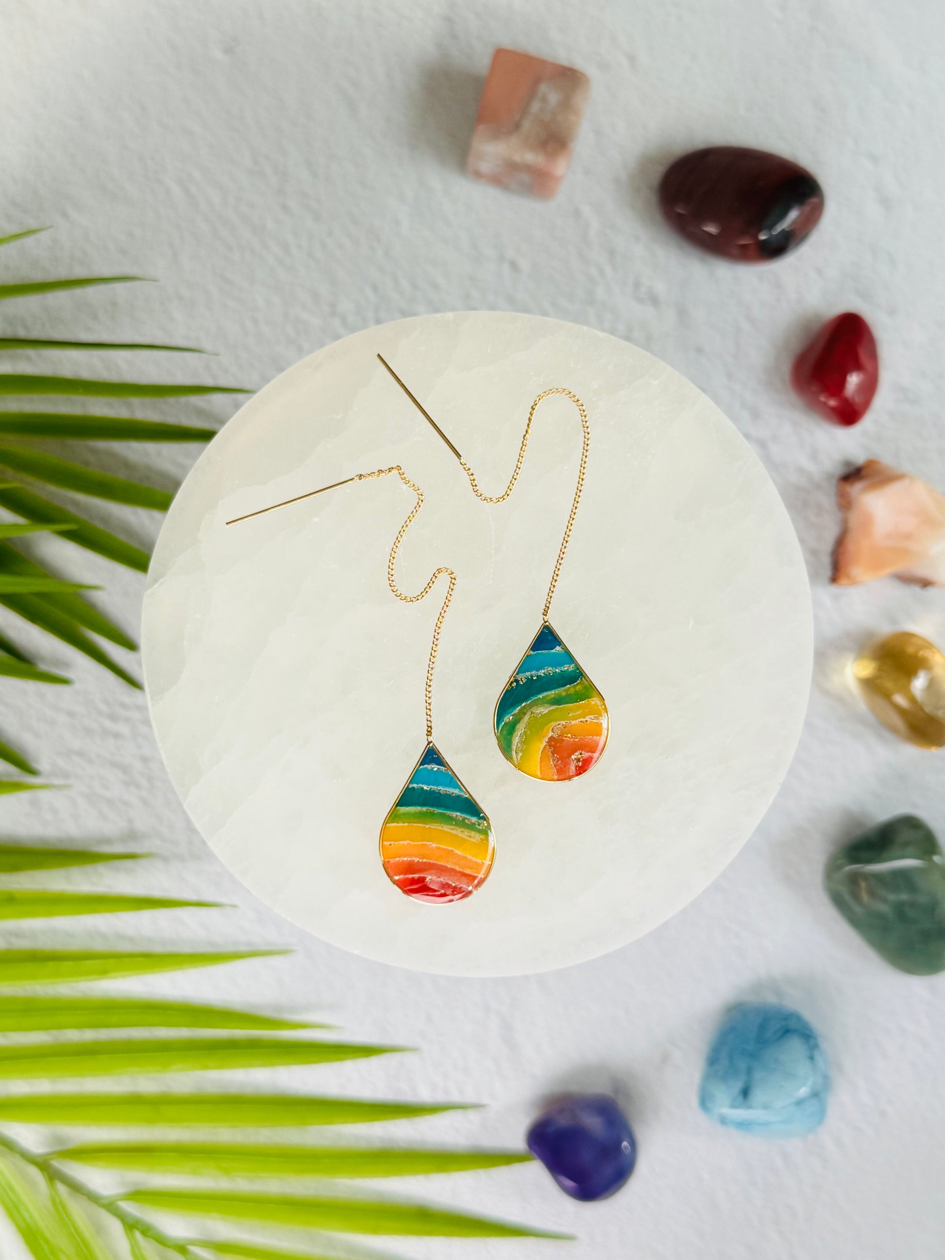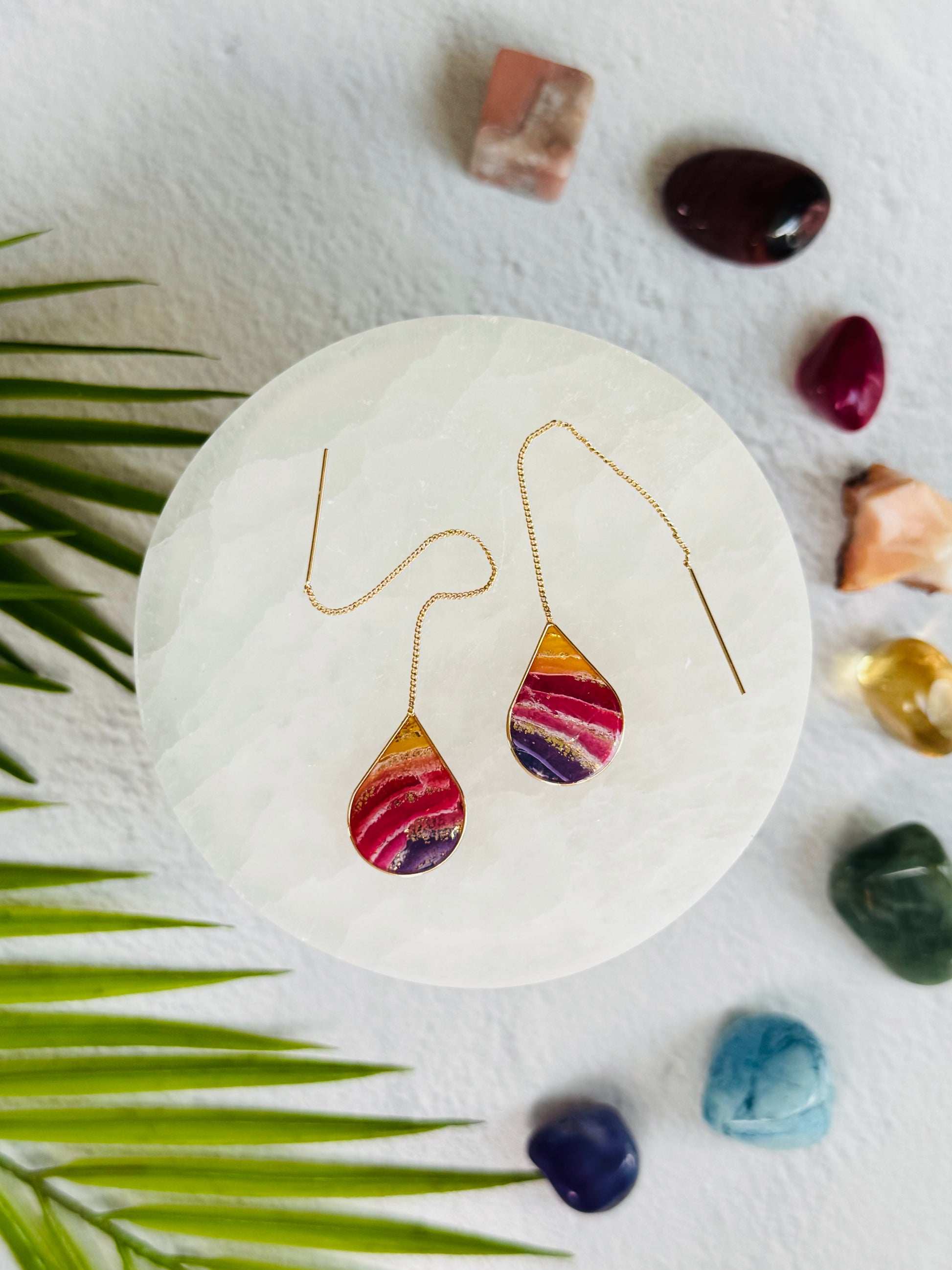 Teardrop bezeled "agate" threader earrings, available in gold (18k gold-plated brass) or silver (rhodium-plated brass). Nickel-free.