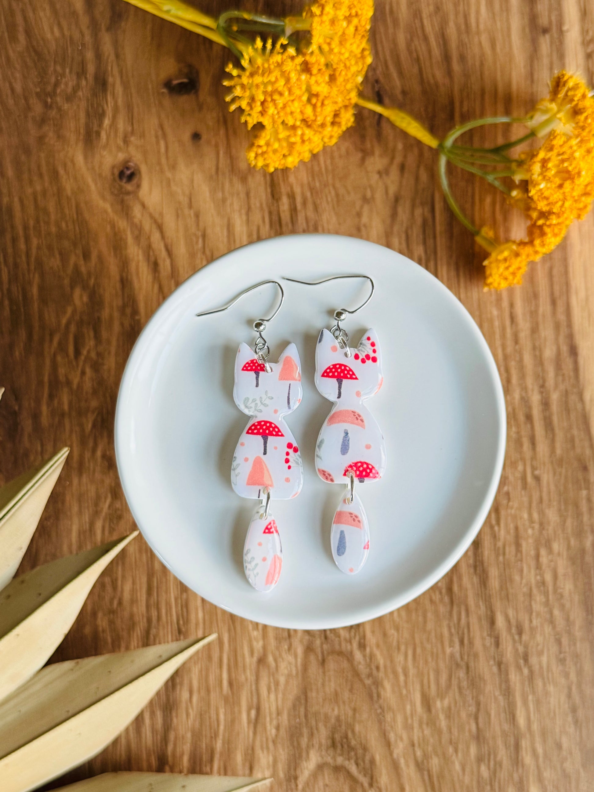 Shroom-print cat dangle earrings. Available on gold or silver classic fishhook. (Gold alloy/rhodium plated respectively, nickel-free hooks.)