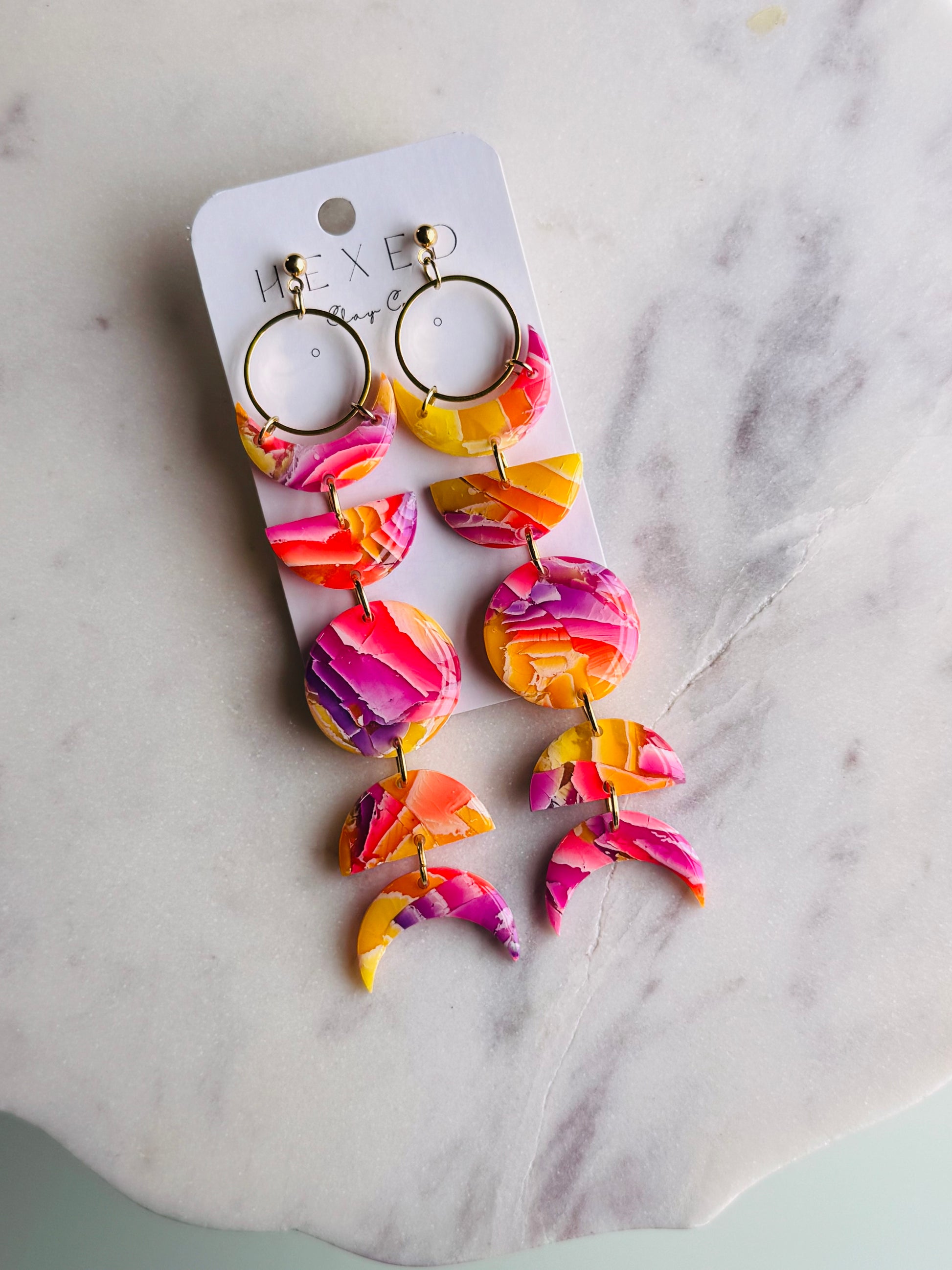 Moon phase earrings in bright sunset hues. On a gold ring connector and gold ball post (gold alloy-plated, nickel free posts).